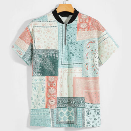 Mens Linen Cotton Zipper Polo Shirts Resort Inspired Bandana Print Summer Shirt Lightweight Breathable